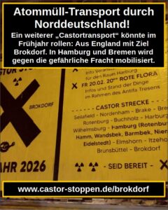 Am Dienstag, 20. Januar, findet in Bremen eine Infoveranstaltung zum Widerstand gegen Big Tech und den baldigen CASTOR-Transport statt. Erwartet wird nämlich im Frühjahr die Durchfahrt von Atommüll aus der britischen Wiederaufarbeitungsanlage Sellafield mit Ziel Brokdorf. Dienstag, 20.01.2026 um 19.30 Uhr im Infoladen Bremen, St. Pauli Str. 10-12