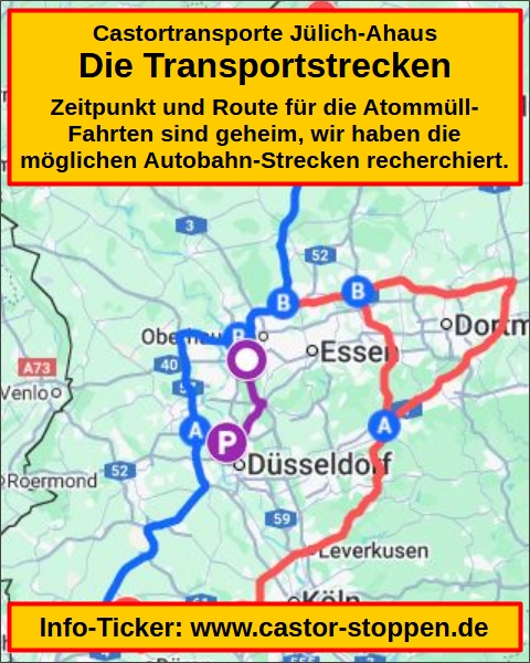 Grundsätzlich sind Transportroute und -zeitpunkt geheim. Es gibt natürlich viele Möglichkeiten für die LKW-Transporter aus Jülich über die Autobahnen Ahaus zu erreichen. In unserer Streckenkarte haben wir die wahrscheinlichste Route eingezeichnet (blau). Einige Streckenabschnitte scheiden wegen des Gewichts der Castoren aus (Brückennutzung: Zwei Castor-Testfahrten führten durch Duisburg – über die Berliner Brücke (A59). Obwohl diese Strecke für Schwertransporte nicht mehr infrage kommt).