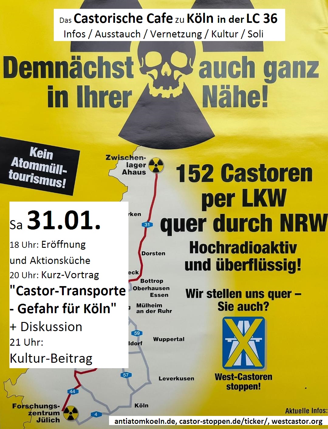 Am Samstag, 31. Januar, findet ab 18.00 Uhr in Köln erneut das „Castorische Cafe“ statt, wo unter anderem zu den Castortransporten Jülich – Ahaus informiert wird: