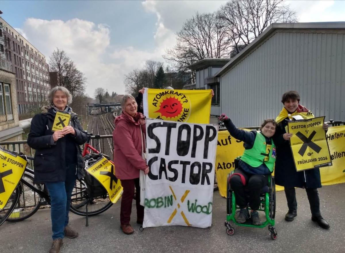 Kleine Proteste gab es heute anlässlich eines Aktionstages an einigen Orten entlang der möglichen Castor-Strecken von Jülich nach Ahaus und in Hamburg, wo ein Atommüll-Zug zum AKW Brokdorf fahren könnte. Hintergrund ist, öffentliche Aufmerksamkeit zu erregen. Jeder Atommüll-Transport birgt das Risiko schwerer Unfälle oder Anschläge. Die Behälter rollen in Zwischenlagerhallen, wo sie langfristig nicht bleiben können.