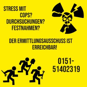 Der erste Castortransport steht vor der Tür. Erfahrungsgemäß kann es im Umfeld der Transporte und Proteste zu allerlei Kontakt mit der Polizei kommen. Egal ob es um Platzverweise, Identitätskontrollen oder Festnahmen geht: Der Ermittlungsausschuss ist für euch erreichbar unter 015151402319. Meldet euch und passt aufeinander auf!