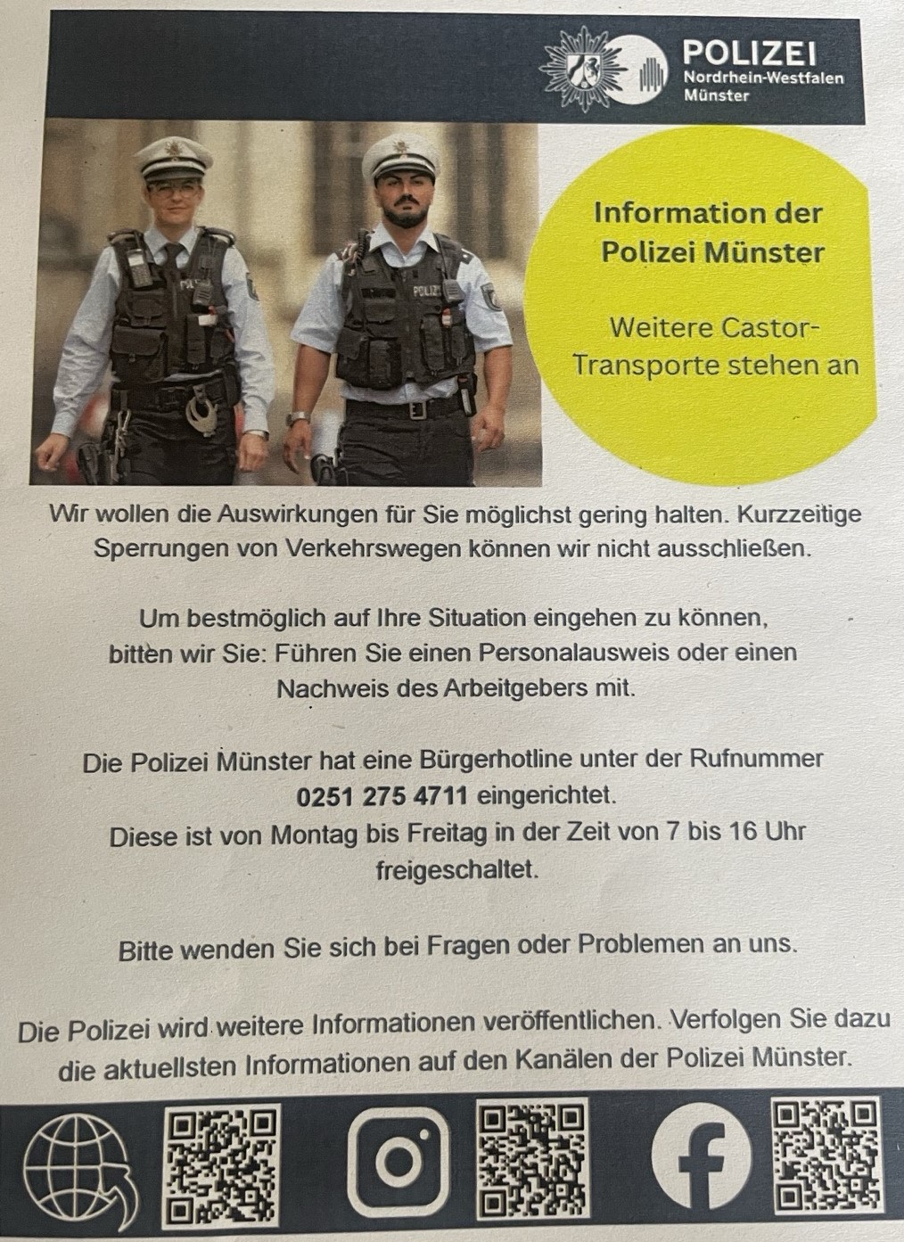 Auch wenn bei diesem anstehenden zweiten Transport bisher wenig zu den konkreten Einsatzvorbereitungen in die Öffentlichkeit gedrungen ist: Die Polizei Münster informiert aktuell Anwohner:innen des Zwischenlagers in Ahaus mit Flugblättern über mögliche Einschränkungen – weil ein weiterer Castortransport anstehen würden. Der Transporttermin wie auch die Route des Schwertransports von Jülich nach Ahaus über 170km Autobahn ist geheim. Wir rechnen mit der Abfahrt des nächsten Castors am Dienstag Abend (21. April).