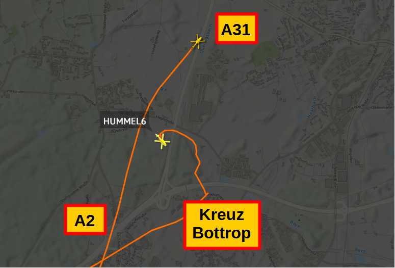 Polizei-Begleithubschrauber über Kreuz Bottrop, Ausschnitt: flightradar.live