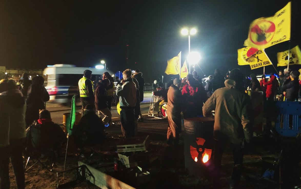 Der Castortransport war gegen 1.20 Uhr bei Gescher – und kommt nun seinem Ziel Ahaus immer näher. Vor dem Zwischenlager hat die Polizei einen Wasserwerfer vorgefahren. Dort harren bei der Mahnwache ca. 40 Aktivist*innen aus und erwarten den Transport mit lautstarkem Protest.
